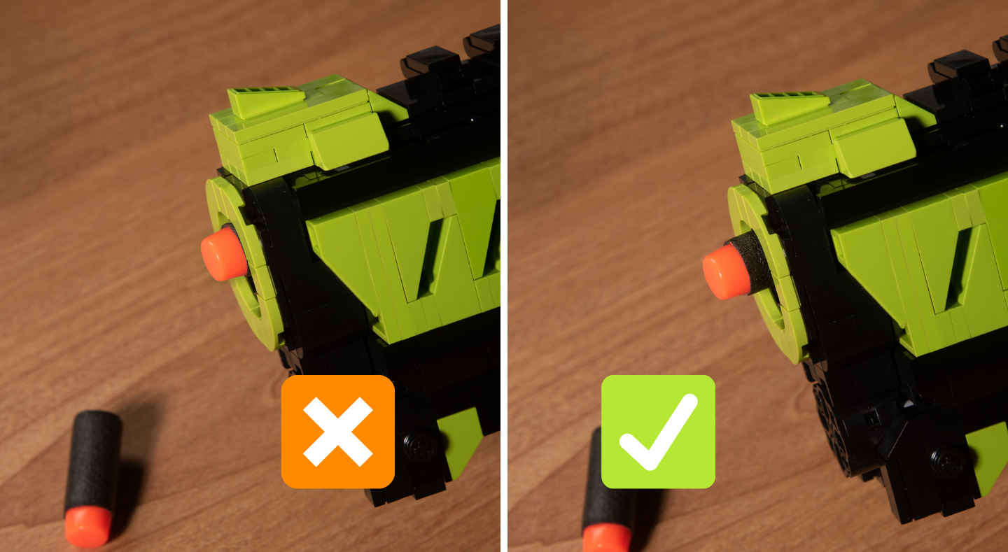 Foam darts aren’t a fan of pressure. 😉 Pop them in gently, and let the blaster do the work.
