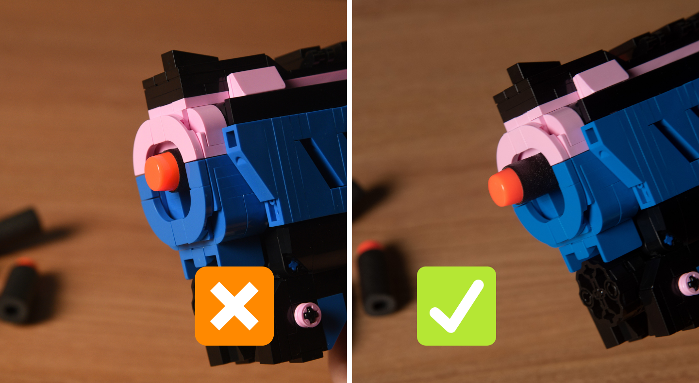 Foam darts aren’t a fan of pressure. 😉 Pop them in gently, and let the blaster do the work.